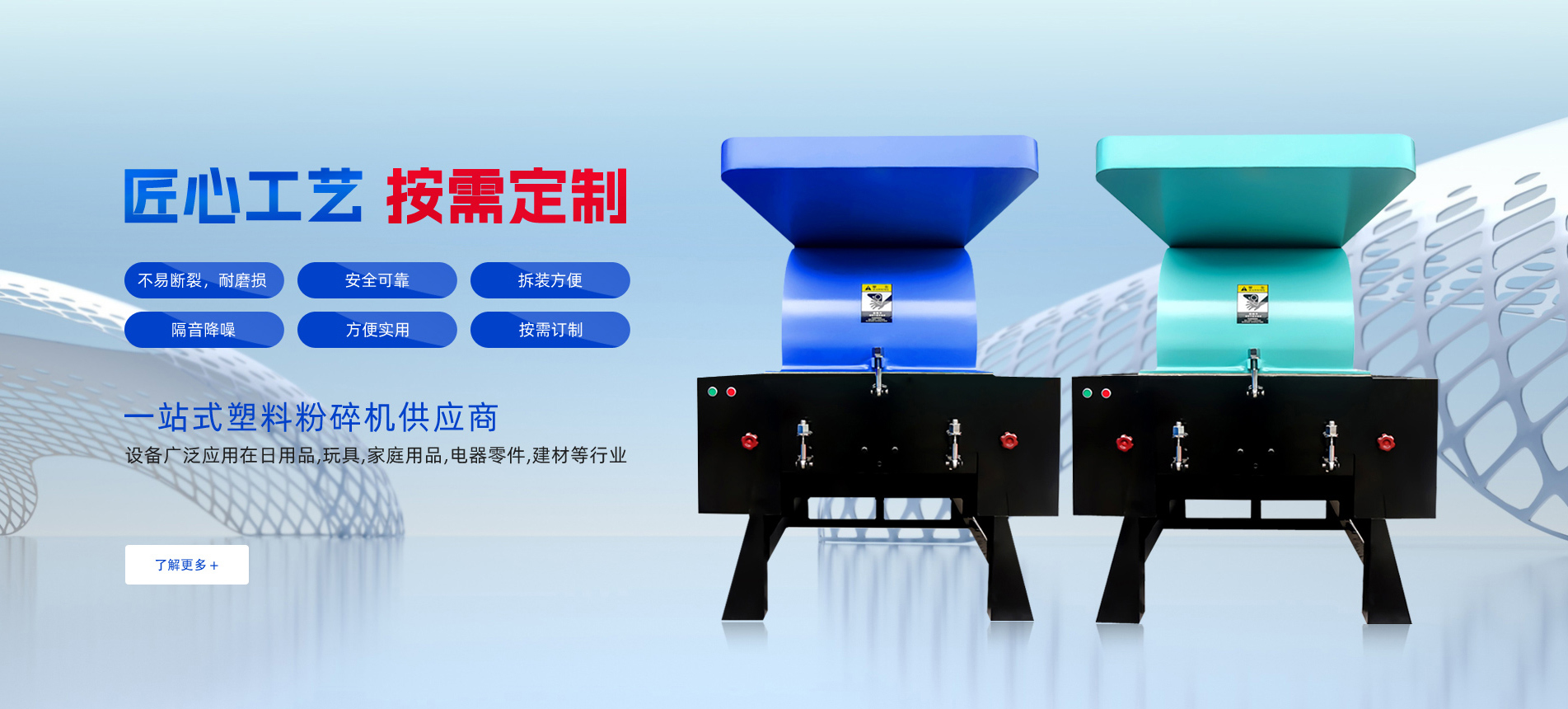 本公司系列產(chǎn)品以其卓越的性能、高性價(jià)比聞名于塑料輔助機(jī)械行業(yè)。主要產(chǎn)品有:粉碎機(jī)、 干燥機(jī)、吸料機(jī)、模溫機(jī)、拌料機(jī)、冷水機(jī)、冷卻塔等等!我公司還聯(lián)合了國(guó)內(nèi)知名的塑機(jī)輔機(jī)經(jīng)銷商,希望為廣大用戶提供子力品牌系列的優(yōu)質(zhì)產(chǎn)品和更及時(shí)更完善的售后服務(wù)!